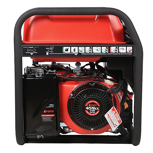 В основе установки лежит 4-тактный двигатель, размещенный в прочной раме с отличным охлаждением на резиновых подушках, минимизирующих вибрацию. Все узлы, требующие проведения техобслуживания, находятся под рукой. Двигатель бензинового генератора можно быстро подготовить к работе и интенсивно эксплуатировать продолжительное время. Для хранения топлива служит большой бак объемом 40 литров, которого хватает на 12 часов работы без дозаправки при нагрузке около 3/4.