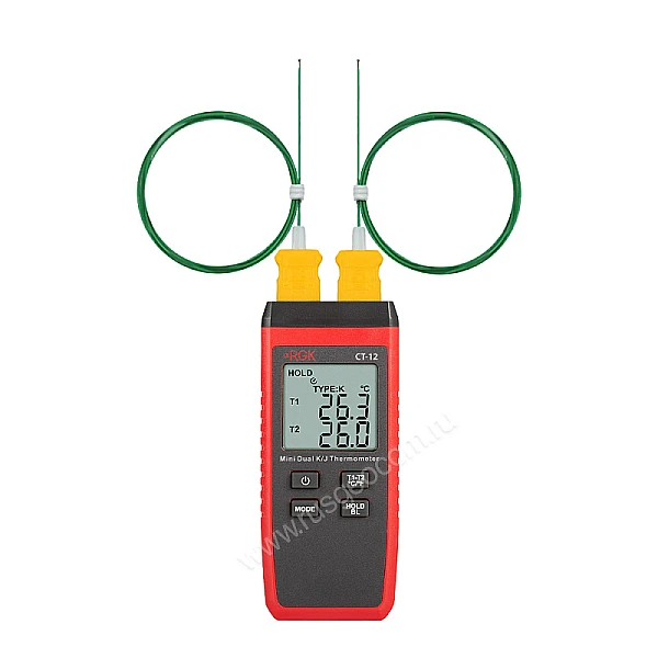 За счет небольшого веса компактный двухканальный цифровой термометр RGK CT-12 удобен для проведения длительных инспекций в полевых условиях, легко помещается в карман одежды или сумки. С большого дисплея показания считываются легко и без путаницы между каналами. Корпус прибора выполнен из прочного пластика, снабжен рельефными участками для надежного захвата и выдерживает падение с метровой высоты.