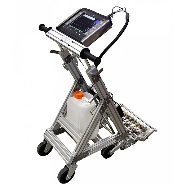 Установка контроля состоит из ультразвукового многоканального дефектоскопа УСД-60-8К и механической части на которой установлен акустический 16-ти элементный блок ультразвуковых преобразователей, коммутатор и система подачи акустической жидкости.